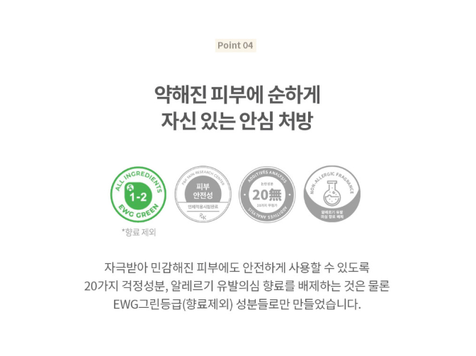 全成分EWG綠色等級、完成皮膚低刺激測試、無添加20種擔憂成分,各種肌膚皆可適用。